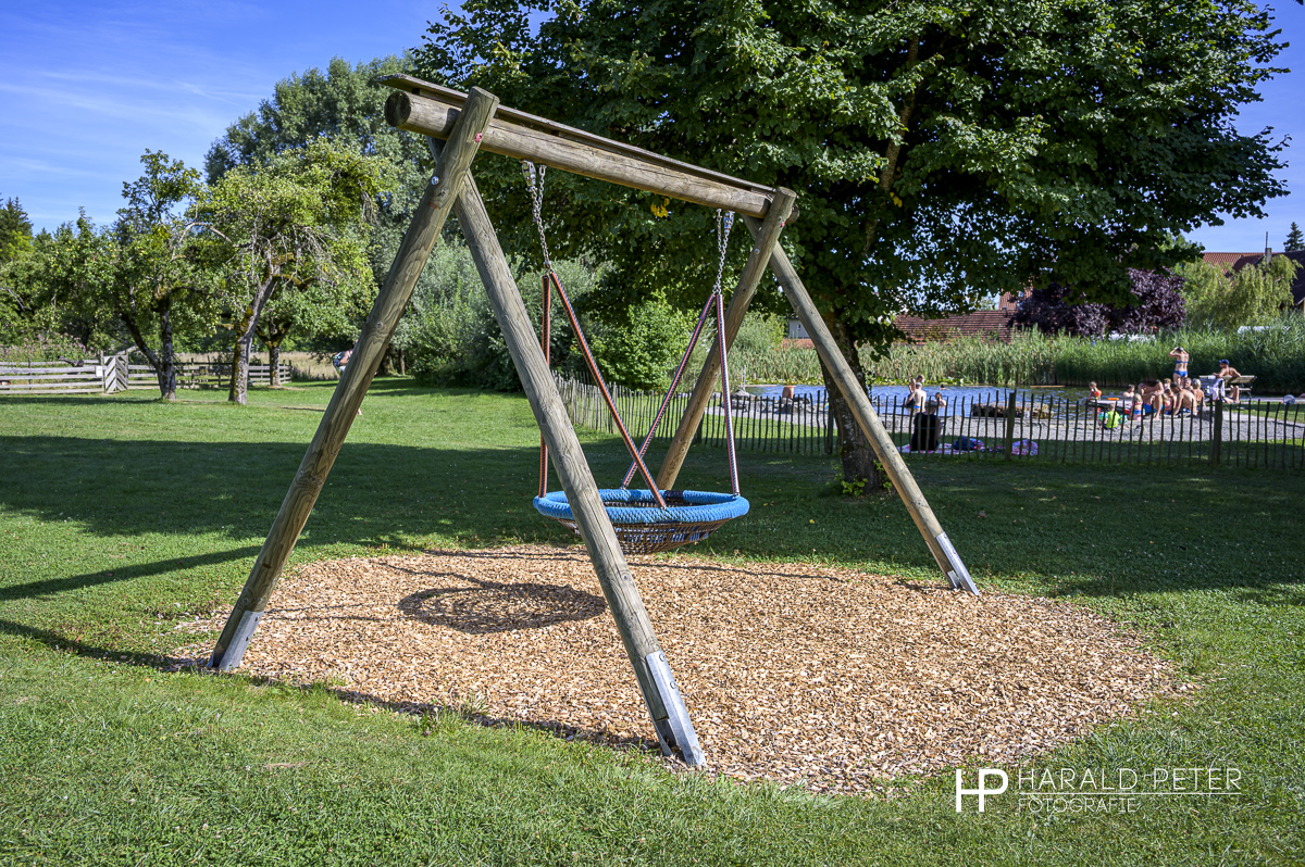 Eine große Spielwiese mit Vogelnestschaukel, ein Fußballplatz, ein Beach-Volleyballfeld, eine Boggiabahn, ein Kletterturm und eine Tischtennisplatte. So viel Platz und Möglichkeiten regen zur Bewegung und zum Spielen an. Langeweile gibt es nicht!